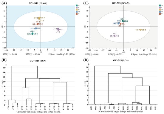 (A) PCA plot based on the results of GC–IMS; (B) HCA analysis based on the results of GC–IMS; (C) PCA plot based on the results of GC–MS; (D) HCA analysis based on the results of GC–IMS; (GT: green tea, JT: jasmine tea, OT: osmanthus tea, MT: michelia tea, RT: rose tea).