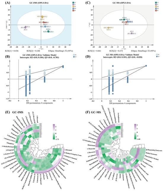 (A) OPLS–DA plot based on the results of GC–IMS; (B) a permutation test was performed to validate the OPLS–DA model established using the results of GC–IMS; (C) OPLS–DA plot based on the results of GC–MS; (D) a permutation test was performed to validate the OPLS–DA model established using the results of GC–MS; (E) heat map analysis of marker metabolites (VIP > 1) identified by means of GC–IMS; (F) heat map analysis of marker metabolites (VIP > 1) identified by means of GC–MS. (GT: green tea, JT: jasmine tea, OT: osmanthus tea, MT: michelia tea, RT: rose tea).