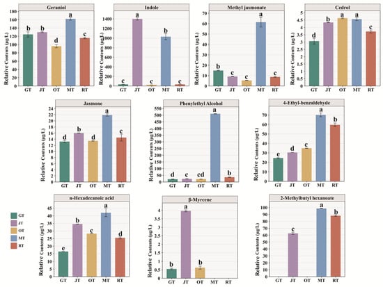 Relative content of key aroma compounds in different tea samples (mean ± SD). The different letters on the bar chart indicate that the content of compounds was significantly different (p < 0.05). (GT: green tea, JT: jasmine tea, OT: osmanthus tea, MT: michelia tea, RT: rose tea.).