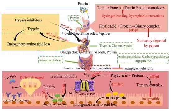 | lectins | Reduced by 7% to 85% | [49,76,87] | Specific recognition with N-acetylgalactosamine and galactose in intestinal epithelial cells damages the intestine, interferes with the secretion of intestinal digestive enzymes, and inhibits protein digestion. | [126] |