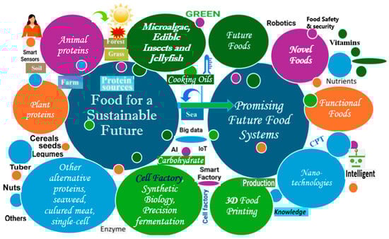 In today’s world, where natural resources are polluted, mismanaged, and seriously depleted, developing a sustainable food system that will feed the increasing population while protecting ecosystems and natural resources continues to be a challenging task. Providing sufficient, environmentally sustainable, nutritious, safe, and accessible food for everyone is at the top of sustainable goals. It is important to raise awareness about sustainability in the food industry. Food in the future aims to address the global food supply, food security, nutrition, and health problems by producing healthier, safer, more nutritious, and more delicious food to guarantee human survival [19,20]. However, new and efficient sustainable food systems are needed because the current long supply chain-based food system cannot feed the global population and creates negative ecological, environmental, logistic, and nutritional pressures [21]. Agricultural systems are not compatible with global targets for food and nutrition, climate, environment, and livelihood security [22], and may even become victims of the environmental degradation they cause. Therefore, major transformation is needed to ensure nutrition and food security, as well as to meet climate, diversity, and health goals [23]. In the future, food systems will need major changes to increase food production by using fewer resources and reducing food waste. With food safety and sustainable food production, nanoparticles, nanoemulsions, conjugates, microorganisms, functional materials, modified biopolymers, and genes are becoming increasingly important issues in the field of food science [24]. In the food industry, the emergence and development of new foods and new food industries, the evolution and increased use of functional foods, and the use of nanotechnology have been reviewed as increasing trends. However, the precautionary principle should not be ignored, as the food opportunities provided by innovation processes and technologies may have unknown effects on health [25]. In this review, future sustainable foods and alternative protein sources, factors affecting food and nutrition security, and promising food systems are evaluated, and suggestions for future research and food trends are offered.
