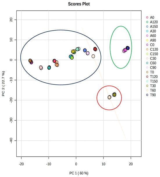 An unsupervised PCA scores plot of phenolic and carotenoid metabolites obtained via the HPLC-UV analysis of three spinach varieties and different nitrogen supplies. ‘Acadia’ (A), ‘Crosstrek’ (C) and ‘Traverse’ (T) were treated with different N concentrations including 0, 30, 60, 90, 120 and 150 mg/L.