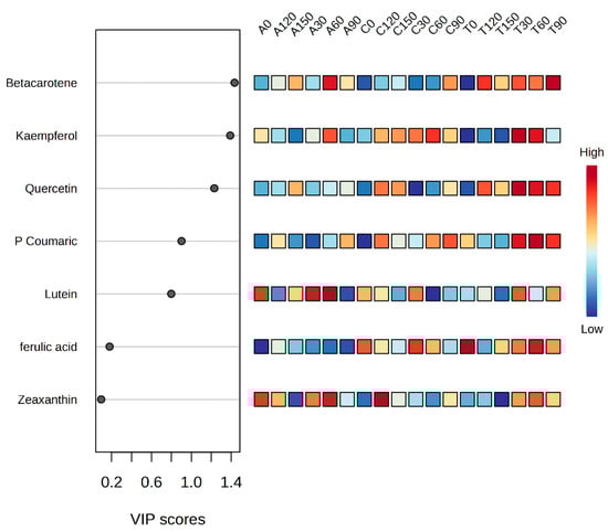 VIP scores in PLS-DA assigned to phenolic and carotenoid compounds found in baby spinach cultivars grown with different N concentration levels. ‘Acadia’ (A), ‘Crosstrek’ (C) and ‘Traverse’ (T) were treated with different N concentrations including 0, 30, 60, 90, 120 and 150 mg/L.