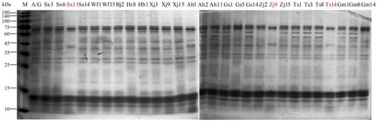 SDS-PAGE analysis of wheat albumins and globulins hydrolyzed by Fructilactobacillus sanfranciscensis strains. M, molecular weight standard proteins; A/G, non-hydrolyzed proteins.