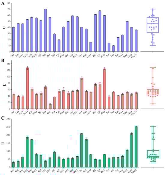 In general, LAB strains have multiple auxotrophs [35]. F. sanfranciscensis transports peptides and further degrades them into amino acids, relying on various intracellular peptidases for growth during sourdough fermentation and contributing either directly or indirectly to sourdough characteristics [18]. F. sanfranciscensis strains possess the highest aminopeptidase, dipeptidase, tripeptidase, and iminopeptidase activities [17]. We also characterized the peptidase activities of different F. sanfranciscensis strains, including PepN (aminopeptidase), PepV (dipeptidase), and PepT (tripeptidase) (Figure 2). All strains exhibited PepN, PepV, and PepT activities. PepN, a general aminopeptidase with broad specificity, has been characterized in diverse LAB strains [36]. This enzyme can hydrolyze the N-terminal amino acids from a wide range of peptides of varying lengths and N-terminal amino acid residues [31]. As shown in Figure 2A, the PepN activity of F. sanfranciscensis strains exhibited a wide range from 9.90 ± 0.13 U (Ts3) to 70.36 ± 0.16 U (Hr8). Hr8 and Zj9 were the strains showing the highest activity (70.36 ± 0.16 U and 67.50 ± 0.47 U, respectively). PepV and PepT specifically hydrolyze di- and tripeptides, respectively. These enzymes exhibit broad specificity and prefer di-/tripeptides that contain hydrophobic amino acids such as leucine, phenylalanine, methionine, or glycine [36]. The strains’ PepV activity varied from 15.41 ± 1.60 U (Hb1) to 127.71 ± 5.10 U (Sx14), with 57.51 U as the median value (Figure 2B). Sx14, Zj15, and Gs1 were the strains which possessed the highest PepV activity (127.71 ± 5.10 U, 124.27 ± 3.46 U, and 95.44 ± 3.91 U, respectively). For PepT, the majority of strains showed activities ranging from 40 U to 80 U (Figure 2C). The strains Sx14, Wf1, Gs1, Gs5, Gm8, and Gm14 showed significantly higher activities than the other strains, with Gm14 possessing the highest PepT activity (252.17 ± 2.19 U). These three intracellular peptidases from F. sanfranciscensis were characterized in previous research. The genes encoding PepN and PepT were identified in F. sanfranciscensis DSM 20451T [32], and PepN and PepV were purified in F. sanfranciscensis CB1 [37]. The results in this study illustrated variable peptidase activities among the different F. sanfranciscensis strains isolated from traditional sourdoughs, in line with the results of De Angelis et al. [14].