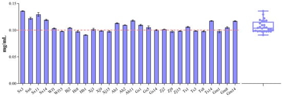 EPSs produced by LAB during sourdough fermentation improve dough rheology and the textural quality of bread and steamed bread [18,38,39]. In addition, Seitter et al. [40] demonstrated that the crude EPS extracts of F. sanfranciscensis strains increase stickiness and resistance, but decrease the extensibility of wheat dough. Here, we characterized EPS production in different F. sanfranciscensis strains. As shown in Figure 3, most strains produced approximately 0.1 mg/mL of EPS. Sx3 and Sx11 exhibited slightly higher EPS production abilities than the other strains (0.136 ± 0.0007 and 0.130 ± 0.004 mg/mL, respectively). The results indicated no significant difference in EPS production among F. sanfranciscensis strains. EPSs are formed by the metabolism of sucrose through the action of a fructosyltransferase enzyme, most likely levansucrase (LevS) in F. sanfranciscensis [41,42]. Thus, the slight difference in levansucrase ability or the relevant gene (levS) expression in F. sanfranciscensis strains may explain their similar EPS production abilities; however, this should be verified in further studies.