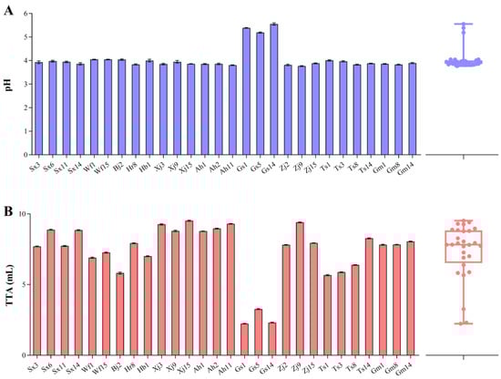 pH (A) and TTA (B) values of sourdough fermented with F. sanfranciscensis. Box plots show median values (–), 75th and 25th percentiles of the data (top and bottom of plots, respectively), and maximum and minimum values (top and bottom error bars, respectively). All data points are presented in the plots.