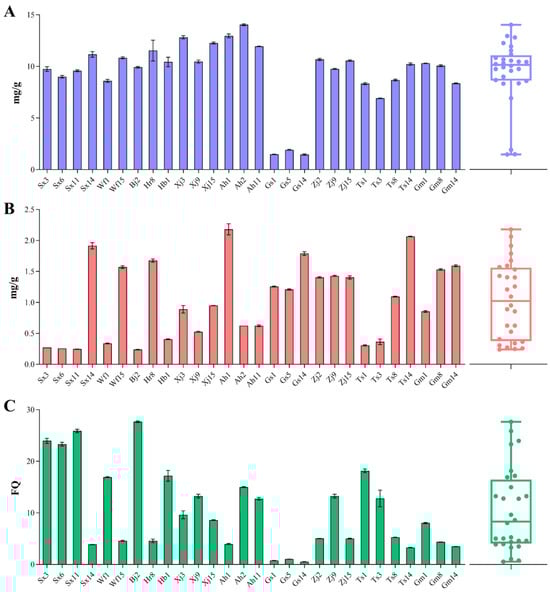 Lactic and acetic acids, two major acids produced by LAB, are important for the sensory qualities of sourdoughs [18]. Therefore, we determined lactic and acetic acid levels in each sourdough sample. As shown in Figure 5, lactic and acetic acid synthesis varied among the different F. sanfranciscensis strains. The concentration of lactic acid ranged from 1.45 ± 0.07 (Gs14) to 14.04 ± 0.09 (Ah2) mg/g. Strains Ah2, Ah1, and Xj3 showed the highest abilities to produce lactic acid (14.04 ± 0.09, 12.96 ± 0.19, and 12.82 ± 0.15 mg/g, respectively). In addition, the sourdoughs fermented by Gs1, Gs5, and Gs14 exhibited the lowest lactic acid concentrations, indicating that a weak ability to produce lactic acid might be the main reason for the significant difference in the pH and TTA values of their fermented sourdoughs compared to those of other strains. Acetic acid is regarded as a crucial flavor enhancer that, along with lactic acid, catalyzes the Maillard reaction [46]. The concentration of acetic acid varied substantially from 0.24 ± 0.003 (Bj2) to 2.18 ± 0.090 (Ah1) mg/g, with a median value of 1.04 mg/g. Ah1, Ts14, and Sx14 were the strains showing the highest abilities to produce acetic acid (2.18 ± 0.090, 2.06 ± 0.006, and 1.92 ± 0.05 mg/g, respectively). The lactic-to-acetic acid molar ratio, defined as the fermentation quotient (FQ), is a fermentative parameter widely used to link acidity and flavor [14,18]. The most recommended value of FQ is below 5.0 for sourdough fermentation [2]. Variations in lactic and acetic acid contents determined the differences in FQ. As shown in Figure 5C, FQ exhibited large fluctuations from 0.54 ± 0.02 (Gs14) to 27.67 ± 0.15 (Bj2), with a median value of 10.14. Similar results can be found in the previous study performed by De Angelis et al. [14]. Strains Bj2, Sx11, Sx3, and Sx6 showed the highest FQ (27.67 ± 0.15, 25.88 ± 0.34, 23.97 ± 0.49, and 23.33 ± 0.35, respectively), whereas Gs14, Gs1, and Gs5 had the lowest value (0.54 ± 0.02, 0.78 ± 0.01, and 1.06 ± 0.01, respectively). Among all strains, 46.4% had FQ < 5. In general, a combination of obligate and facultative heterofermentative LAB species is required to obtain an ideal FQ [47]. However, according to the results of this study, some F. sanfranciscensis strains alone could appear to be good candidates for optimal FQ.