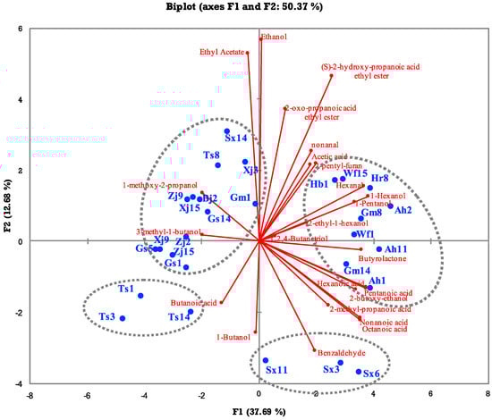 Principal component analysis biplot showing volatile compounds in sourdoughs fermented with 28 F. sanfranciscensis strains. Samples divided into the same group are marked by circles.