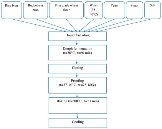 In the straight dough method, 5% rice bran and 10% buckwheat bran in dry form and 85% of first-grade wheat baking flour, salt, and pressed baking yeast, as well as sugar according to the recipe and water in the amount that provides dough moisture 48.0%, were added to the dough (Figure 1).