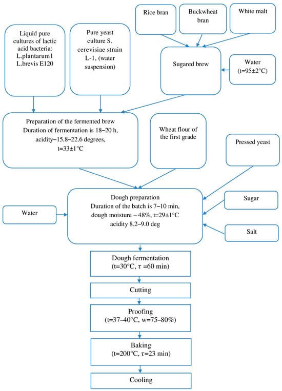 The main and additional raw materials were used: wheat baking flour of the first grade, produced in “Tsesna-Astyk” LLP (Astana, Kazakhstan); rice bran, produced by one of the dynamically developing companies of the agricultural industry, in PT “Abzal and Company” (Kyzylorda region, Kazakhstan); buckwheat bran, selected from “Yeger” LLP (Pavlodar region, Kazakhstan). Granulated sugar (TSZ, Taraz, Kazakhstan), table salt (Aral-Tuz JSC, Almaty, Kazakhstan), pressed yeast (Saf-Neva LLC, Voronezh region, Russia), unfermented barley malt (Leipurin LLP, Almaty, Kazakhstan) were purchased from a local supermarket in Astana, Kazakhstan. As pure cultures of lactic acid bacteria (LAB), the used strains were Lactiplantibacillus plantarum 1, Levilactobacillus brevis E 120, as well as pure culture of yeast Saccharomyces cerevisiae st. L-1 (aqueous suspension) from the museum collection of the St. Petersburg branch of the Research Institute of Baking Industry.