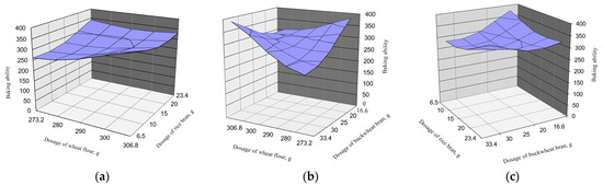 Dependence of flour and bran addition on baking ability: (a) dependence of wheat flour and rice bran addition; (b) dependence of wheat flour and buckwheat bran addition; (c) dependence of rice bran and buckwheat bran addition.