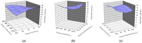 Dependence of flour and bran addition on organoleptic parameters: (a) dependence of wheat flour and rice bran addition; (b) dependence of wheat flour and buckwheat bran addition; (c) dependence of rice bran and buckwheat bran addition.
