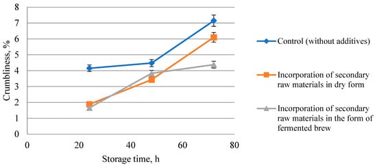 To study the structural–mechanical properties of bread crumbs during storage, we investigated such indicators as moisture, crumbliness, and physical properties of crumb: hardness index. The studies were conducted 2 h after baking, when the temperature in the center of the crumb was 30–36 °C. Then, they were packed in perforated polyethylene bags and stored at room temperature. Samples were analyzed after 24, 48, and 72 h. The crumbliness of bread was determined according to the generally accepted method [61]. For physical properties of the crumb, the hardness index was determined on an ST-2 structrometer.