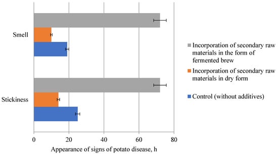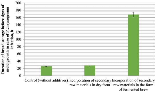 To determine the possibility of suppressing the potato disease of bread, the method of putting finished products infected with spore bacteria into conditions provoking the development of Bacillus subtilis was used. To create provoking conditions, dry bread crumbs infected with B. subtilis spore-forming bacteria and containing 108 KOE/g of spores were introduced during dough kneading. To determine the content of B. subtilis spores in the infected crumb, the method described in the book Microbiology of Baking Production (Afanasyeva O.V., 2003) was used [62]. The bread was stored according to the instructions for the prevention of potato bread disease [63], for which, immediately after baking, the bread was wrapped in damp paper and placed in a thermostat at 37 °C. After 24 h, the bread was cut with a knife and the presence of signs of disease (specific unpleasant odor, sticky crumb) was determined visually. In the absence of disease, the bread was further incubated under the same conditions.