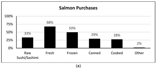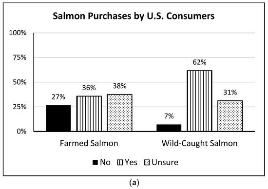 Interestingly, many consumers were unsure as to whether the salmon, shrimp, and/or oysters they purchased were farmed or wild-caught products. It is possible that these consumers did not have a preference (or a choice) regarding the harvest or production method of the seafood available to them, but it could be the case that consumers were unable to easily determine the production method for their choices. That many consumers indicated having eaten wild-caught versus farmed salmon (62% vs. 36%), shrimp (44% vs. 27%), and oysters (51% vs. 28%) illustrates that a relatively high percentage of consumers believe they are eating wild-caught seafood. However, as much as 70% of salmon [36], 90% of shrimp [37], and 90% of oysters [38] eaten in the U.S. are farm raised. The discrepancy may indicate that an even larger percentage of consumers do not know whether their seafood is farm raised or wild caught than indicated via their survey responses, a trend observed and reported by Bacher [39]. Along with evaluating the consumer preference for wild-caught and farm-raised seafood, future studies might investigate whether certain wild-caught and farm-raised seafood labeling strategies are more impactful toward encouraging the purchase and intake of seafood by U.S. consumers.