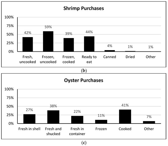 Forms of seafood purchased during the early stages of the COVID-19 pandemic (March 2020–March 2021) by U.S. residents who eat salmon (a), n = 694; shrimp (b), n = 865; and oysters (c), n = 213 (weighted data).