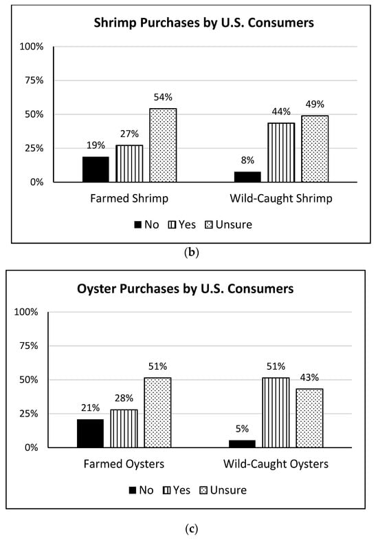 Reported purchases of farm-raised and/or wild-caught salmon (a), shrimp (b), and oysters (c) made during the early stages of the COVID-19 pandemic (March 2020–March 2021) by U.S. consumers who eat salmon (n = 694), shrimp (n = 865), and/or oysters (n = 213) (weighted data).