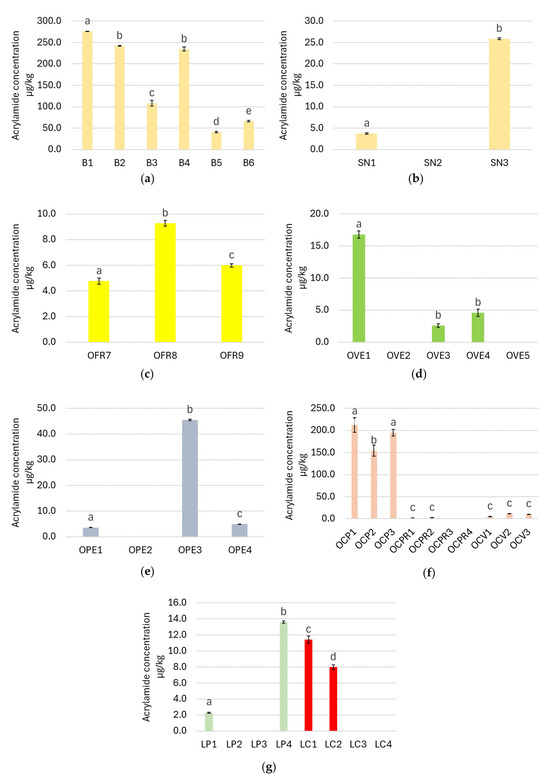 (a) AA concentration (µg/kg) in the different samples of biscuits B1–B6 (additional information about their composition can be found in Table S1). Results are the mean of two determination (technical replicates starting with AA extraction) ± the standard deviation. Different letters (a–e) indicate a statistically significant difference (p < 0.05). (b) AA concentration (µg/kg) in the different samples of snacks SN1–SN3 (additional information about their composition can be found in Table S1). The results are the mean of two determinations (technical replicates starting with AA extraction) ± the standard deviation. Different letters (a–b) indicate a statistically significant difference (p < 0.05). (c) AA concentration (µg/kg) in homogenized plum products OFR7–OFR9 (additional information about their composition can be found in Table S1). The results are the mean of two determinations (technical replicates starting with AA extraction) ± the standard deviation. Different letters (a–c) indicate a statistically significant difference (p < 0.05). (d) AA concentration (µg/kg) in homogenized vegetable foods OVE1–OVE5 (additional information about their composition can be found in Table S1). The results are the mean of two determinations (technical replicates starting with AA extraction) ± the standard deviation. Different letters (a-b) indicate a statistically significant difference (p < 0.05). (e) AA concentration (µg/kg) in homogenized fish foods OPE1–OPE4 (additional information about their composition can be found in Table S1). The results are the mean of two determinations (technical replicates starting with AA extraction) ± the standard deviation. Different letters (a–c) indicate a statistically significant difference (p < 0.05). (f) AA concentrations (µg/kg) in homogenized meat foods OCP1–OCP3, OCPR1–OCPR4, and OCV1–OCV3 (additional information about their composition can be found in Table S1). The results are the mean of two determinations (technical replicates starting with AA extraction) ± the standard deviation. Different letters (a–c) indicate a statistically significant difference (p < 0.05). (g) AA concentrations (µg/kg) in powdered milks (LP1–LP4) and liquid milks (LC1–LC4) (additional information about their composition can be found in Table S1). The results are the mean of two determinations (technical replicates starting with AA extraction) ± the standard deviation. Different letters (a–d) indicate a statistically significant difference (p < 0.05).