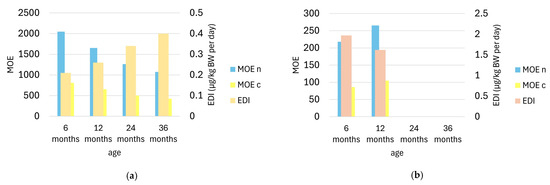 Then, to carry out a risk characterization, it was necessary to calculate the MOE as reported in Equation (2). According to the CONTAM Panel, MOE values below 100 for neurotoxic effects and below 10.000 for carcinogenic effects are of public health concern. In Figure 3, the MOEs for neurotoxic effects are above 100 in all cases and thus not of concern. On the other hand, all MOEs for carcinogenic effects are below 10.000. Although the carcinogenic effect of AA in humans has not yet been demonstrated, the intake of these foods is alarming given the probable carcinogenicity. The effects of biscuit consumption become more worrying as the subject’s age increases (Figure 3a), as they consume more of this food. Comparing MOEs (from biscuits consumption) with those estimated by EFSA, the values are within the range only for 36-month-old subjects, while for the other age groups, the values are beyond the upper margin [10]. Exposure to AA from consuming homogenized chicken products (Figure 3b) can be assessed in subjects up to one year of age, as they tend to diversify their diets and stop eating such products after this age [38]. Their exclusive consumption allows the EFSA-estimated maximum value for daily dietary exposure in children (1.9 µg/kg BW/day) to be reached; therefore, it is necessary to limit their consumption, since AA intake from other foods ingested during the day compounds the situation.