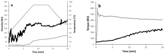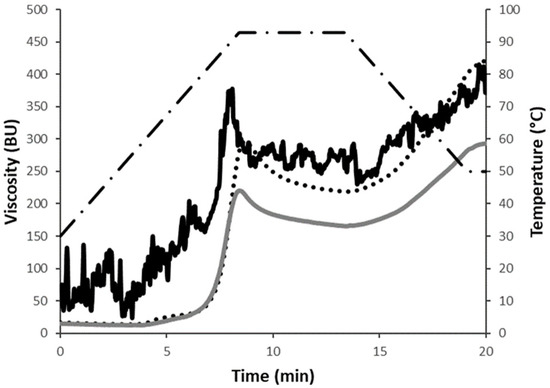 Starch gelatinization and retrogradation properties were evaluated using the ViscoQuick (Brabender GmbH and Co KG, Duisburg, Germany), which measures the viscosity variations in samples mixed with distilled water, which underwent rotative movement (250 rpm) and thermal treatments with a cooling and heating rate of +/− 7.5 °C/min. The applied thermal profile included an initial heating of the suspension (10 g sample in 105 mL distilled water) from 30 to 95 °C, followed by 5 min of holding at 95 °C; finally, the slurry was cooled to 50 °C at a speed of −7.5 °C/min. The test was carried out in duplicate and one representative curve for each sample was shown.