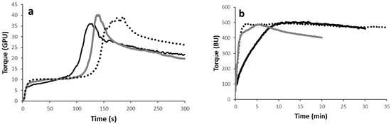 The changes in consistency/torque upon mixing a dough prepared with either sprouted chickpea grits and flour at a constant hydration level (50%) are shown in Figure 1b. Chickpea flour exhibited a rapid increase in torque that can be explained as a rapid water uptake from non-starch polysaccharides and/or damaged starch. After that, dough torque was quite constant, ranging from about 480 to 400 UB. Similar profiles were detected in red lentils [24]. In the case of chickpeas, the dough achieved maximum torque values of around 300 BU, which reset to zero after 12 min of mixing [13].