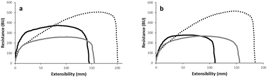 Extensional properties of wheat alone (black dotted line) or in mixture at 25% with sprouted chickpea grits (black solid line) and flour (grey solid line): (a) analysis carried out after 45 min of resting; (b) analysis carried out after 90 min of resting. BU, Brabender units. A representative curve for each sample is reported.