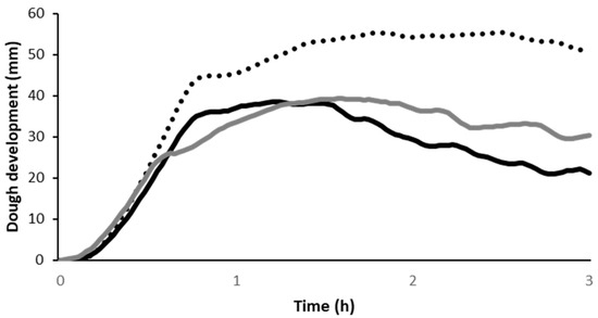 Dough development during the leavening of wheat alone (black dotted line) or in mixture at 25% with sprouted chickpea grits (black solid line) and flour (grey solid line). A representative curve for each sample is reported.