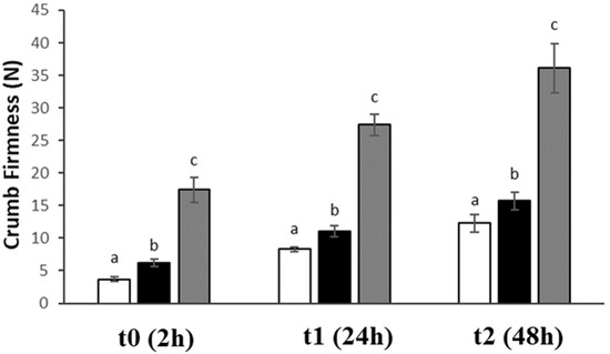 Crumb firmness of bread prepared with wheat (white column), 25% chickpea grits (black column), and 25% chickpea flour (grey column). Analyses were carried out at t0 (2 h), t1 (24 h), and t2 (48 h). Data are expressed as mean ± standard deviation (n = 8). Different letters at the same storage time indicate significant differences (one-way ANOVA, Tukey’s HSD test, p ≤ 0.05).