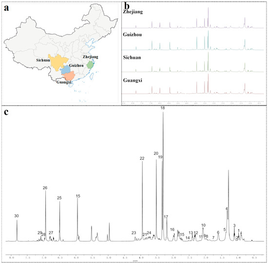 Geographical origin and characteristic 1H NMR profiles of LJT samples. (a) Samples of LJT were gathered based on their designated geographical source. (b) Comparative 1H NMR spectra of LJT extracts sourced from diverse geographical regions. (c) 1H NMR spectrum of LJT depicted in a representative manner.
