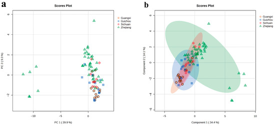 To evaluate the classification accuracy of LJT, PCA was employed using 1H NMR chemical fingerprints. Additionally, it helped in visualizing the distinction between different groups and the variability within each group (Figure 2a). Given that principal components (PCs) are formed by linearly combining the original variables, the visualization of PCA is limited in its ability to capture the entirety of variance [21]. The PCA results indicated an overlap among samples in the PCA score plot, with notable similarities between samples from Guangxi and Guizhou, likely due to their geographical proximity. Interestingly, similarities were also observed between samples from Zhejiang and Sichuan, suggesting that geographical factors significantly influence tea quality [22].