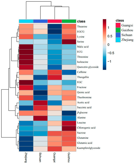 Heatmap and hierarchical clustering analyses were employed to visualize the metabolites of LJT sourced from various geographical origins (Figure 3). Hierarchical clustering was performed based on the mean values of 25 metabolites selected by ANOVA across samples from four origins. The grouping of LJT samples by origin revealed three hierarchical branches. The first branch includes samples from Guangxi and Guizhou; the second branch comprises samples from Guangxi, Guizhou, and Sichuan; and the third branch indicates that Zhejiang differs from the other three origins. The hierarchical clustering roughly corresponds to the geographical proximity of the origins. LJT from Zhejiang exhibits comparatively elevated levels of polyphenols, amino acids, and alkaloids in comparison to other regions. Conversely, Zhejiang demonstrates relatively diminished concentrations of certain organic acids (such as acetic acid, succinic acid, and chlorogenic acid) and sucrose when compared to the aforementioned regions. The main flavor components of tea are amino acids (umami), flavonoids (bitter and astringent), and alkaloids (bitter) [24]. Therefore, the differences in these substances in the LJT provide clues for origin discrimination and quality assessment.