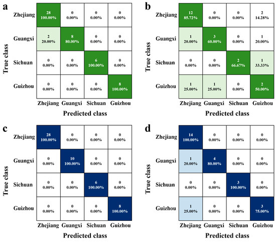 The confusion matrices for different models were obtained using all the data from 78 LJT samples from four production areas. (a) Training set of LDA. (b) Testing set of LDA. (c) Training set of RF. (d) Testing set of RF. The darker the green and blue colours in the matrix squares, the higher the accuracy rate.