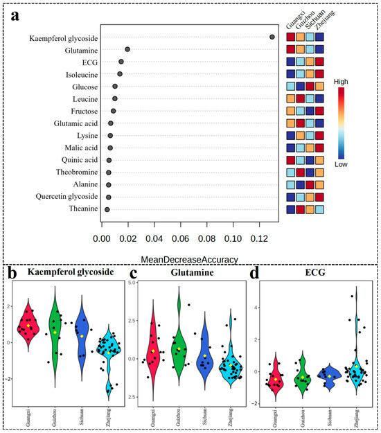 (a) Significant features identified by the random forest algorithm; (b) Kaempferol glycoside, (c) Glutamine, and (d) ECG box. The black dots in the fiddle diagram represent the relative content values for each sample, and the yellow dots represent the within-group average values.