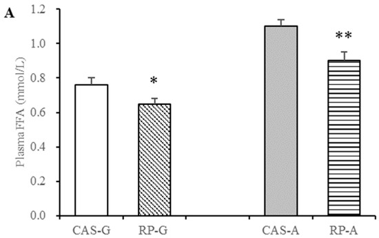 As illustrated in Figure 2, after 2 weeks feeding, compared with CAS-G and CAS-A, plasma triglyceride levels were distinctly depressed in the RP-G group by 11.36% and in the RP-A group by 16.13% (p < 0.05, Figure 2A). Similarly, hepatic triglyceride accumulations were also distinctly depressed in the RP-G group by 23.99% and in the RP-A group by 28.78% (p < 0.05, Figure 2B), as, respectively, compared to the CAS-G and CAS-A groups.