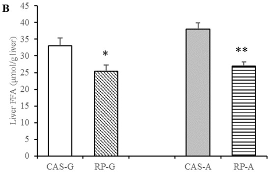 After rice protein intake for 2 weeks, the downward trend in free fatty acid contents were also observed in the rice protein groups, a similar trend to the triglyceride levels. Compared with CAS-G, RP-G exhibited significantly decreased free fatty acid contents to the degrees of 14.47% less in the plasma (p < 0.05, Figure 2A) and of 23.29% less in the liver (p < 0.05, Figure 3B). As for adult rats, free fatty acid contents were markedly decreased in the RP-A group by 18.18% in the plasma (p < 0.05, Figure 3A) and 29.01% in the liver (p < 0.05, Figure 3B).