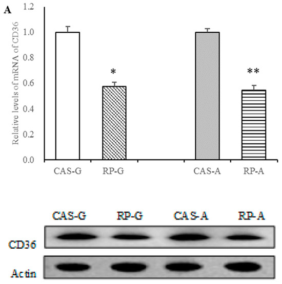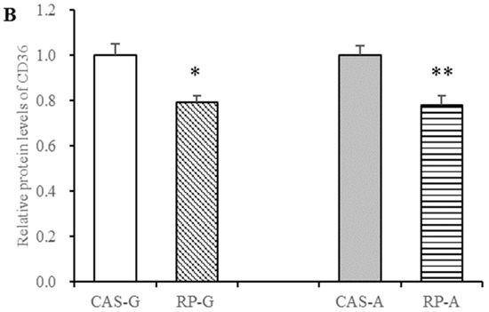Firstly, we measured CD36 expressions. As shown in Figure 4, after 2 weeks feeding, rice protein effectively depressed protein and gene expressions of CD36 in growing and adult rats. Compared with the CAS-G and CAS-A groups, the mRNA levels of CD36 were markedly decreased in the RP-G and RP-A groups (p < 0.05, Figure 4A). Similarly, the RP-G and RP-A groups exhibited lower protein expression of CD36 in growing and adult rats. As illustrated in Figure 4B, hepatic protein levels of CD36 were dramatically reduced by rice proteins, accounting for decreases of 20.61% in the RP-G group (p < 0.05) and of 21.97% in the RP-A group (p < 0.05), as compared to CAS-G and CAS-A. Results showed that CD36 expressions could be downregulated by rice protein feedings in growing and adult rats, for which no significant differences in gene and protein expressions were observed between the RP-G and RP-A groups (p > 0.05), suggesting that the increased age did not attenuate the suppression of CD36 expression induced by rice protein.