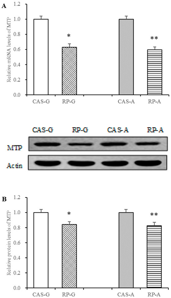 With the intake of rice protein, the dramatic decreases in the mRNA levels of MTP were, respectively, exhibited in the RP-G and RP-A groups (p < 0.05, Figure 5A). Compared with the CAS-G and CAS-A groups, the protein levels of MTP were also significantly decreased in the RP-G group by 16.06% and in the RP-A group by 17.37% (p < 0.05, Figure 5B).