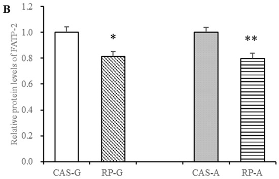 In this study, we focused on the expression of FATP-2 in the liver. Results showed that rice protein exhibited efficacious regulation of the expression of FATP-2 involved in fatty acid transport. As illustrated in Figure 6, the mRNA levels of FATP-2 were dramatically reduced via the intake of rice protein in growing and adult rats (p < 0.05, Figure 6A). Accompanied with a strong downregulation in gene expression, protein levels of FATP-2 were markedly depressed in the RP-G group by 18.68% and in the RP-A group by 20.19%, as compared to the CAS-G and CAS-A groups (p < 0.05, Figure 6B). Thus, it is evident that rice protein can exert a regulatory effect on fatty acid transport, in which the suppressed effect of rice protein on FATP-2 expression was not attenuated by increased age, showing that the suppression was not more efficacious in the RP-A group than in the RP-G group.