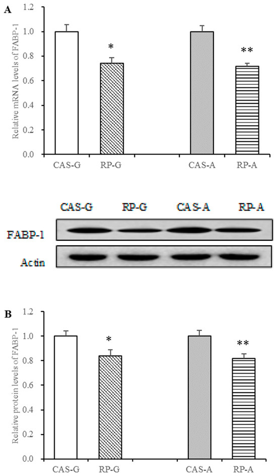 Hepatic mRNA levels and protein expression of FABP-1 in growing and adult rats. (A) Hepatic mRNA levels of FABP-1. (B) Hepatic protein expression of FABP-1. Values are the means ± SEM (n = 6). * p < 0.05, in comparison with CAS-G. ** p < 0.05, in comparison with CAS-A. CAS-A, adult rats fed with casein for 2 weeks; CAS-G, growing rats fed with casein for 2 weeks; FABP-1, fatty acid-binding-1; RP-A, adult rats fed with rice protein for 2 weeks; RP-G, growing rats fed with rice protein for 2 weeks.
