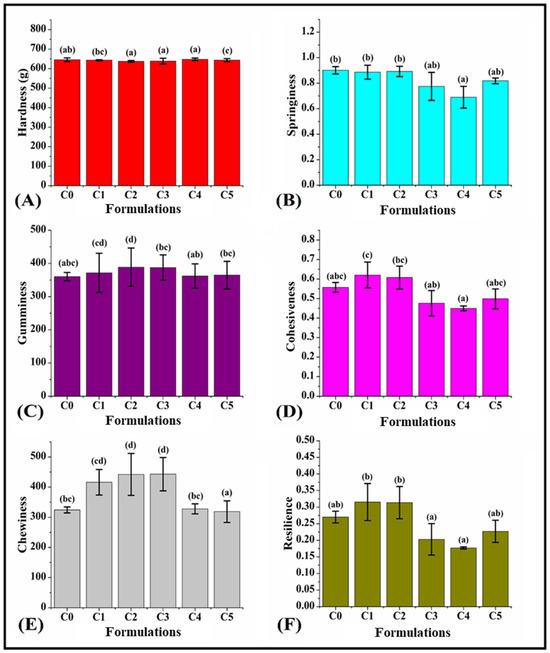 | Softness | 4.45 ± 0.68 b | 3.90 ± 0.70 ab | 4.27 ± 1.00 b | 3.50 ± 1.21 ab | 3.36 ± 1.20 ab | 2.72 ± 1.34 a |