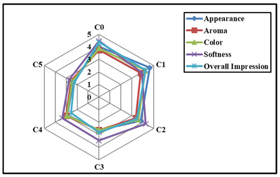| Overall Impression | 4.36 ± 0.80 b | 4.27 ± 0.64 b | 3.45 ± 1.12 ab | 2.81 ± 0.87 a | 2.54 ± 0.03 a | 2.27 ± 1.00 a |