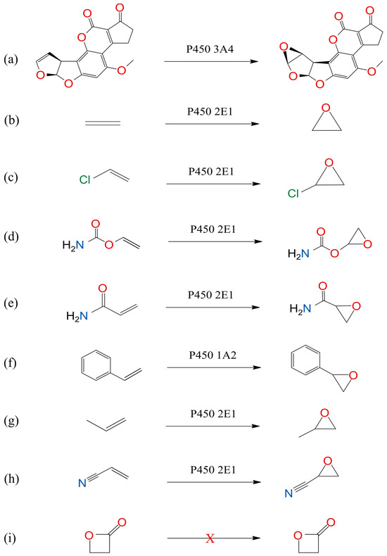 Biotransformations of nine procarcinogens into investigated genotoxic ultimate chemical carcinogens, among which eight require metabolic activation by cytochrome P450 enzymes: (a) aflatoxin B1 exo-8,9-epoxide, (b) ethylene oxide, (c) chloroethylene oxide, (d) vinyl carbamate epoxide, (e) glycidamide, (f) styrene oxide, (g) propylene oxide, and (h) 2-cyanoethylene oxide, while (i) beta-propiolactone needs no metabolic activation by cytochrome P450 enzymes and acts as a genotoxic chemical carcinogen by itself.