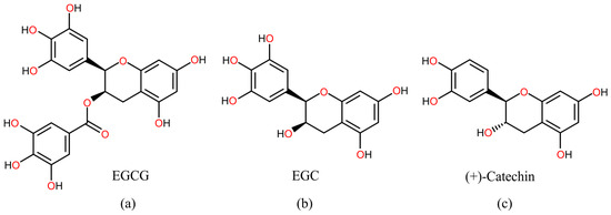 Structural formulas of (a) epigallocatechin-3-gallate (EGCG), (b) epigallocatechin (EGC), and (c) (+)-catechin.