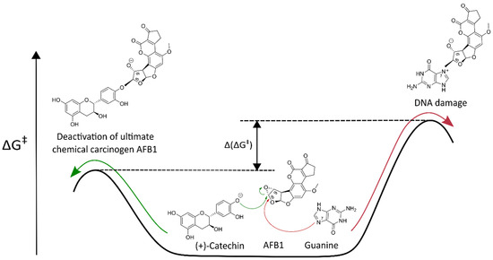 Activation-free energy, , for the reaction between the ultimate chemical carcinogen (AFB1 exo-8,9-epoxide) and its polyphenolic scavenger ((+)-catechin) (green arrow) in comparison with the activation-free energy, , for a competing reaction between the same chemical carcinogen and guanine (red arrow).