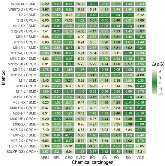 The heat map of differences between the activation-free energies calculated with 14 DFT functionals in combination with the flexible 6-311++G(d,p) basis set and implicit solvation models CPCM or SMD (), and the corresponding experimental activation-free energies () for reactions between the nine investigated chemical carcinogens and guanine. The dark green color designates a good agreement with the corresponding experimental activation-free energy for the alkylation reaction between individual chemical carcinogens and guanine (ideally ), while the light green color designates a poor agreement with the corresponding experimental value (>> 0 or << 0).