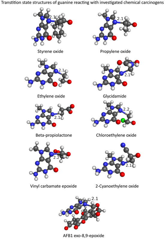 Transition state structures of the nucleophilic attack of the N7 atom of guanine on the achiral carbon in the epoxy ring of the nine investigated chemical carcinogens as predicted by the DFT functional M11-L in combination with the flexible 6-311++G(d,p) basis set and SMD implicit solvation model. The carbon atoms are depicted in gray; the oxygen atoms are red, the nitrogen atoms are blue; the chlorine atom is green; and the hydrogen atoms are white.