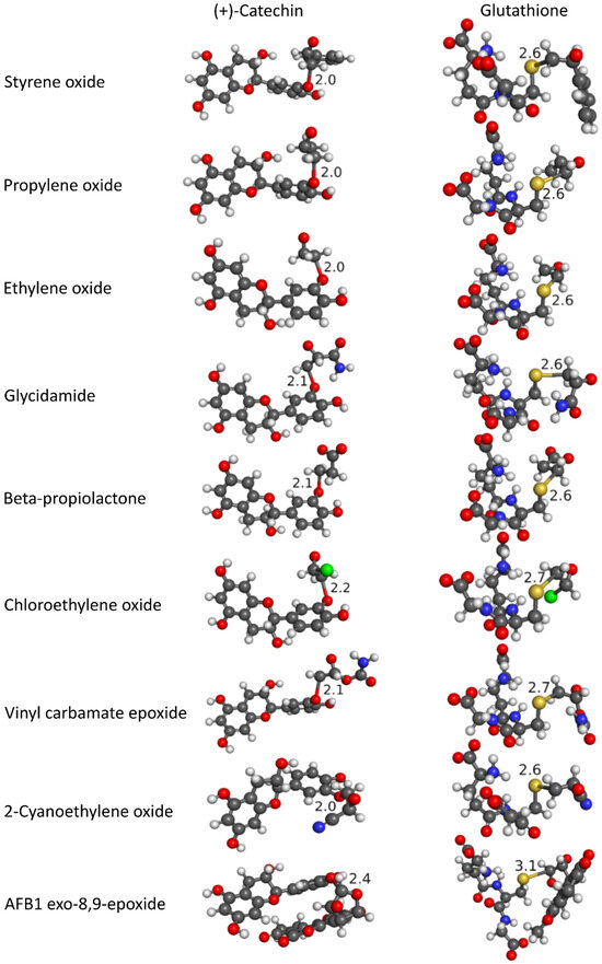 From Figure 7, the formation of a new covalent bond between the most nucleophilic phenolic oxygen atom of (+)-catechin or the sulfur atom of glutathione and the achiral epoxy carbon of nine investigated chemical carcinogens can be observed. The correct transition state structure allocation was also confirmed by the simultaneous cleavage of the covalent bond connecting this achiral carbon with the epoxy oxygen of the chemical carcinogen. The exclusively obtained single imaginary vibrational frequencies (Table 2) corresponding to this reaction path additionally confirm the validity of the proposed SN2 reaction mechanism for alkylation reactions of polyphenolic compounds with investigated chemical carcinogens [43,44].