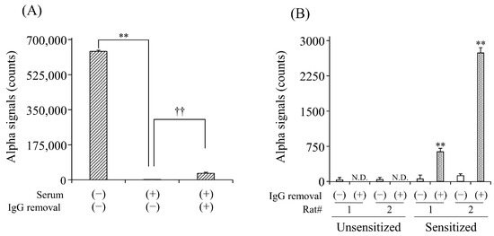 Effect of IgG removal from serum on the detection for serum anti-DNP (A) and anti-OVA (B) sIgE Abs by AlphaCL. Diluted human serum containing anti-DNP sIgE Abs and sera of rats unsensitized and sensitized to OVA were processed on the protein G HP SpinTrap™ column. Net counts were calculated from the total counts in each sample by subtracting the counts in buffer without sIgE Abs. ** p < 0.01 was considered significantly different from buffer solution. †† p < 0.01 was considered significantly different from serum without IgG removal. All experiments were conducted in duplicate. N.D., not detected.