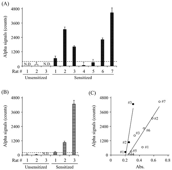 We determined the detection limit for anti-OVA sIgE Abs in rat serum using the AlphaCL. In this analysis, we used the serum of a rat sensitized with OVA (#2), which was diluted to various concentrations with normal rat serum. The ELISA results showed that the non-diluted serum (100%) from this rat contained 5.9 μg/mL of anti-OVA sIgE Abs. In the AlphaCL, the signal counts decreased linearly with the serum dilution, and the signal counts were below the cut-off value at concentrations <6.25%. Therefore, 0.37 μg/mL of anti-OVA sIgE Abs in 6.25% serum was set as the detection limit (Figure 3D).
